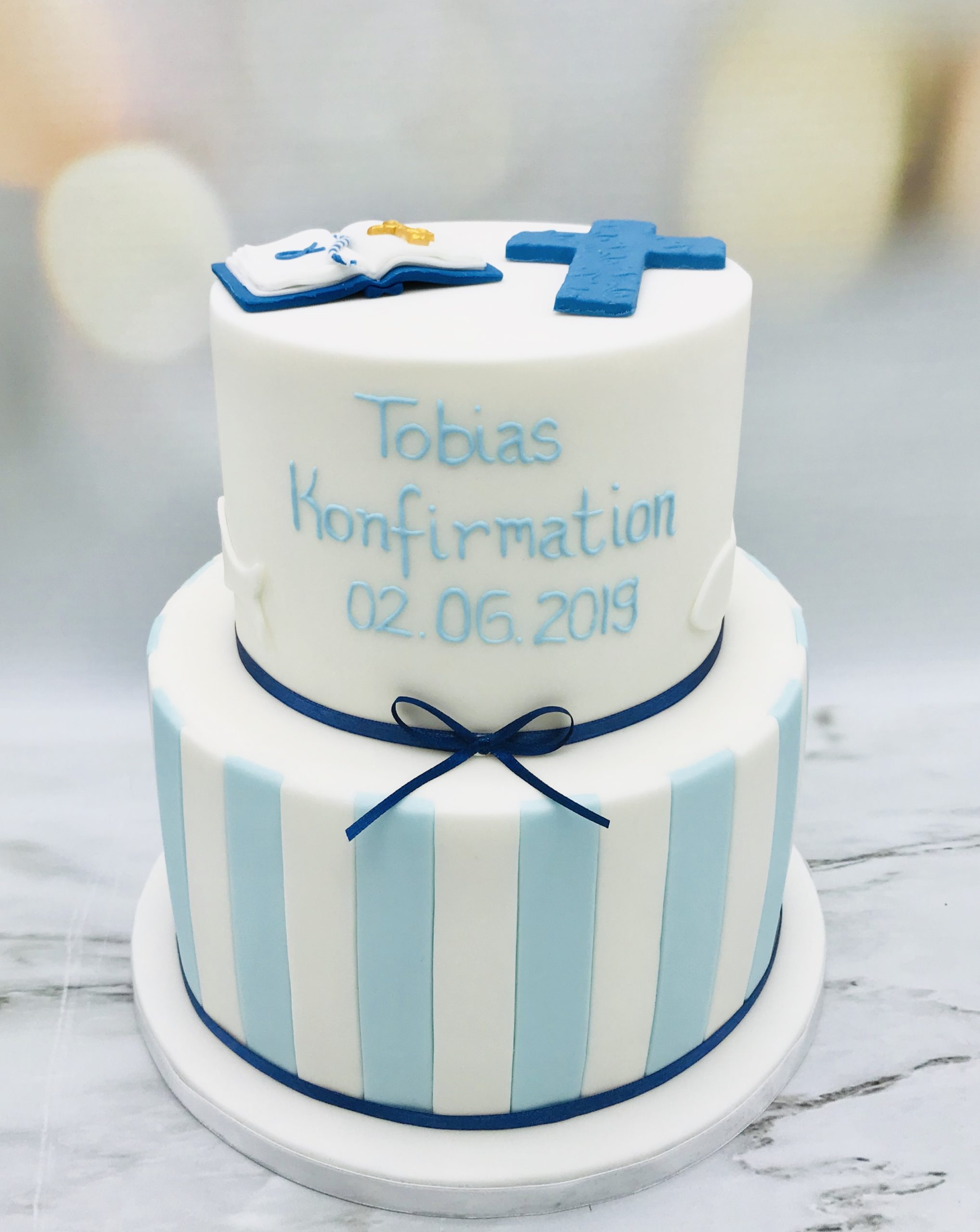 Verzierung: Bibel und Kreuz oben drauf / Streifen / Name, Datum und Wort auf der oberen Etage / Seidenschleife in Dunkelblau.
