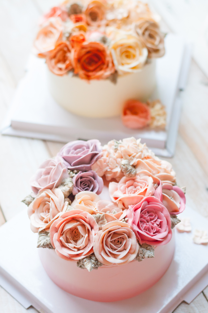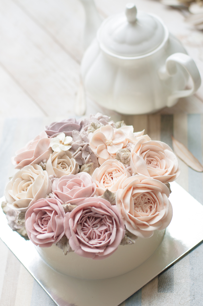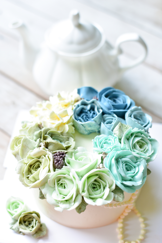 Verzierung: Buttercreme-Blumen in Ihren Wunschfarben.