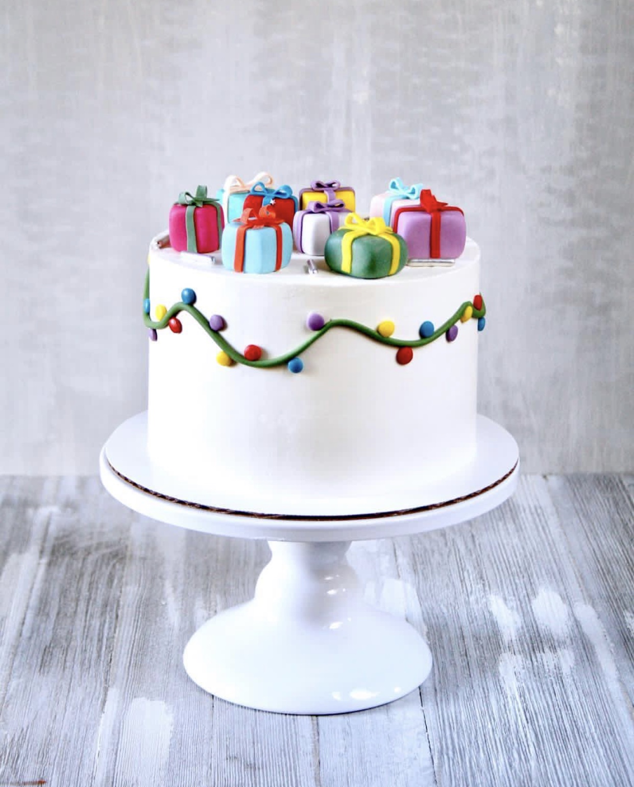 Verzierung: Bunte Lichterkette und Geschenke.