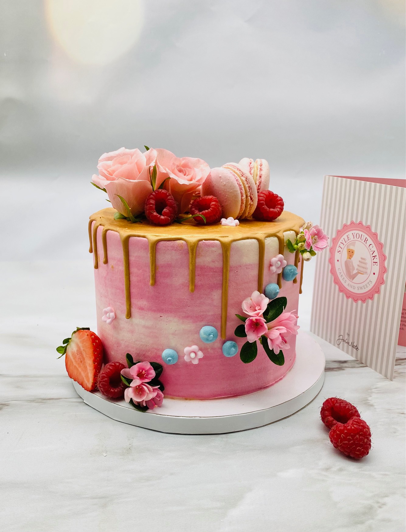 Verzierung: Golden-Drip / Macarons / Blumen aus Fondant / echte Blumen / Beeren