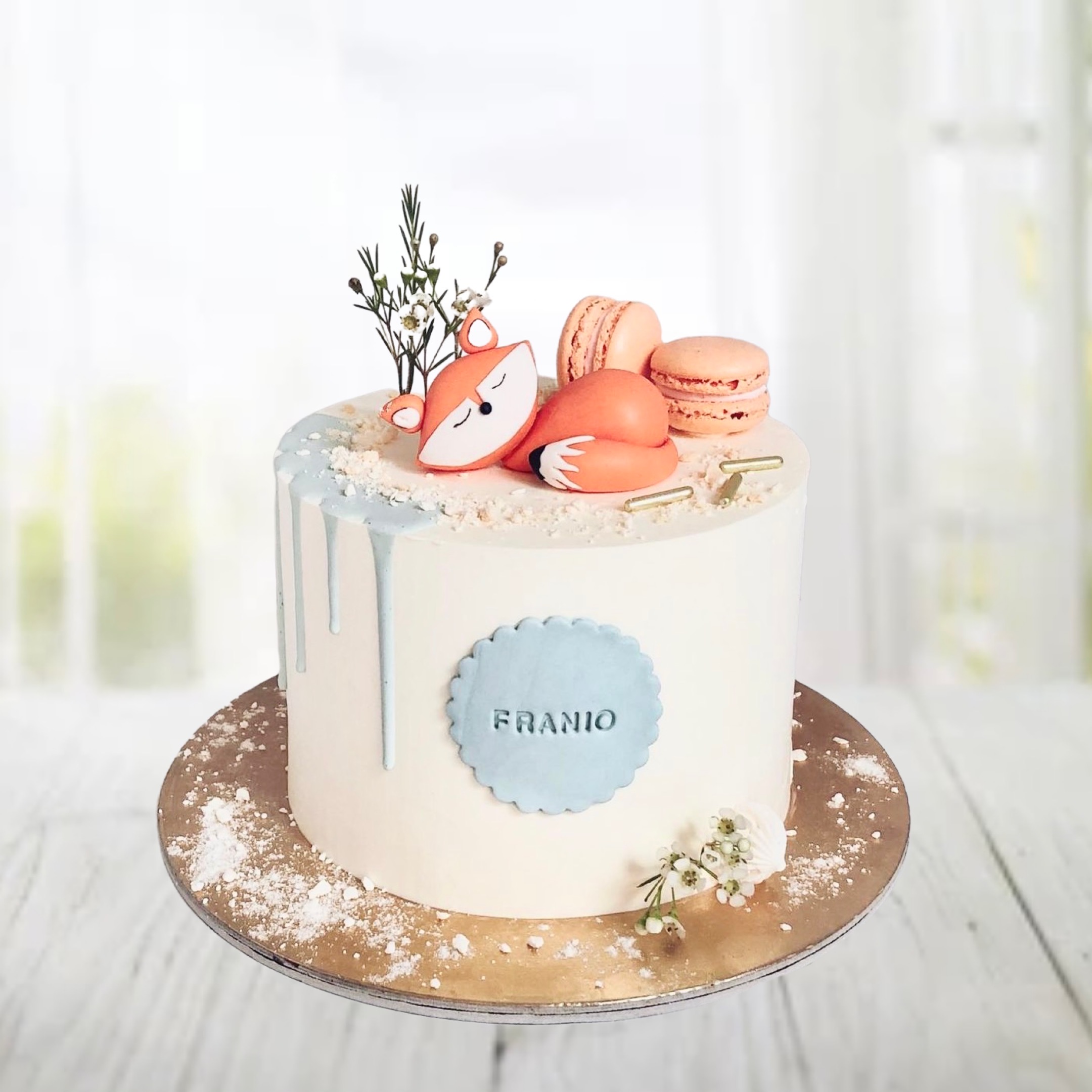 Verzierung: Zweige (nach Saison) / schlafender Fuchs aus Fondant / Name / hellblauer Drip / Macarons