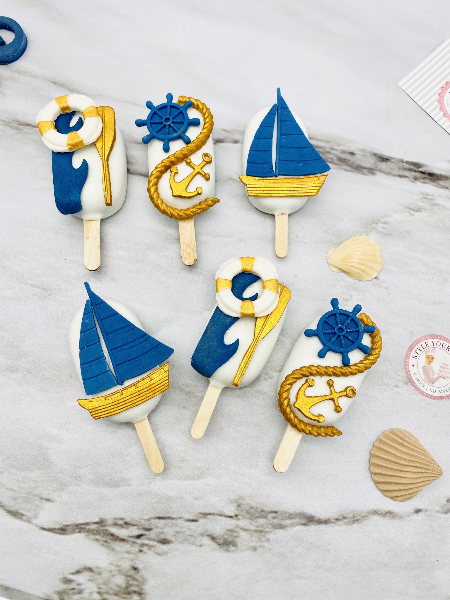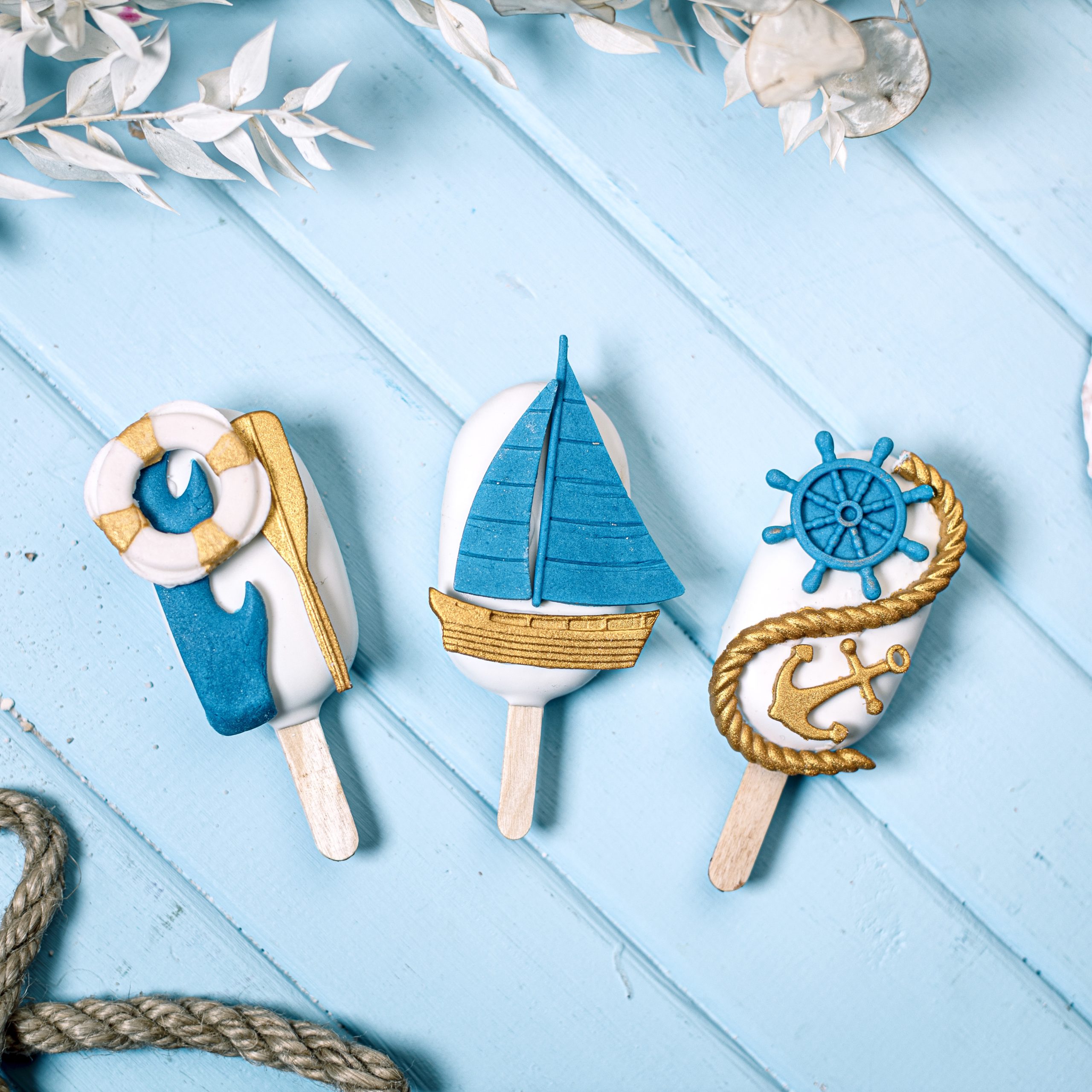 Verzierung: Maritim in Gold, Blau und Rot.