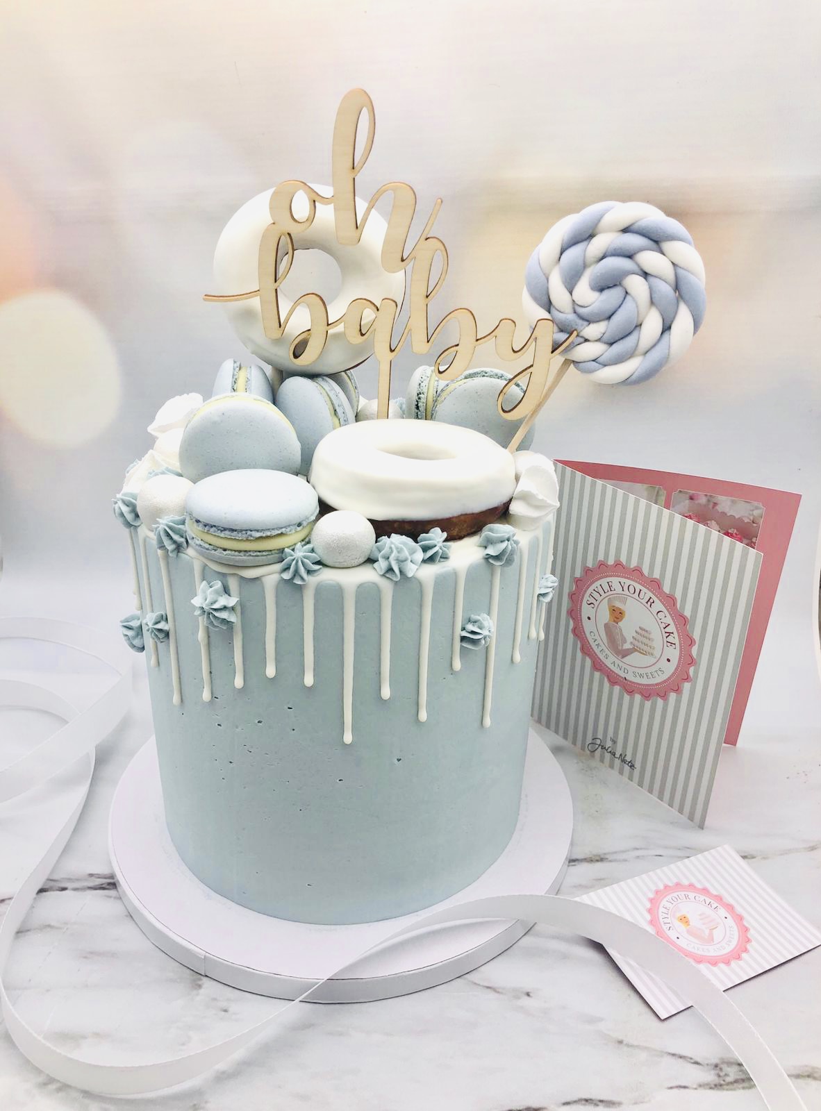 Verzierung: Weißer Zuckerguss-Drip / Macarons / Mini-Donuts / Lollie aus Fondant / Perlen / Caketopper.