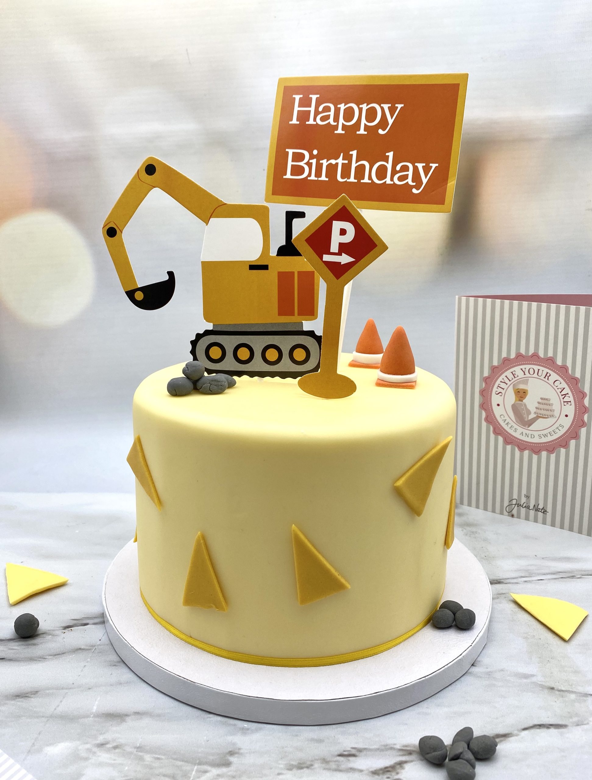 Verzierung: Modellierte Hütchen und Steine / Happy Birthday Schild, Bagger und Schild aus Pappe / Dreiecke.